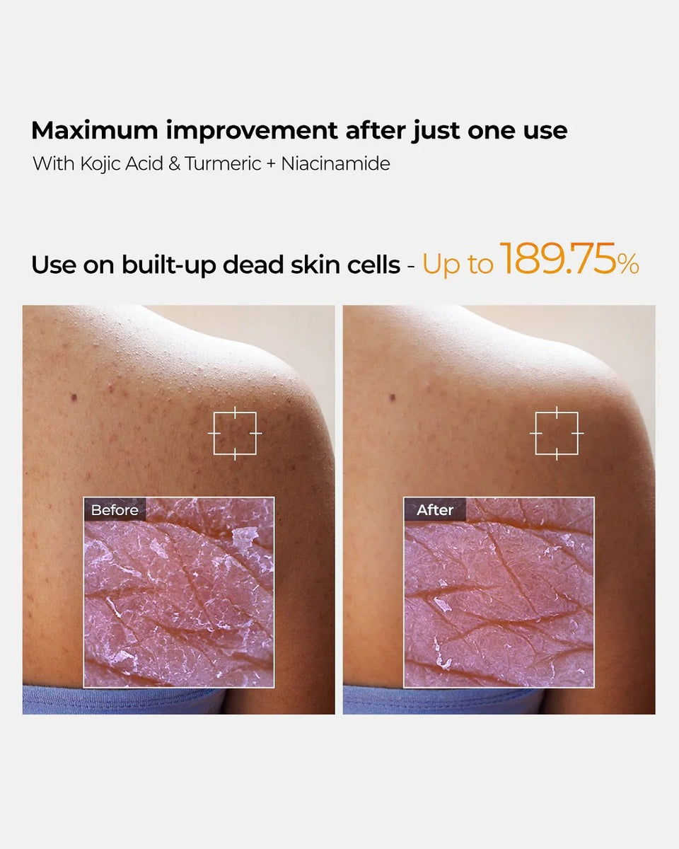 - 99% Pure Kojic Acid + Turmeric instantly break down melanin clusters and dead skin buildup